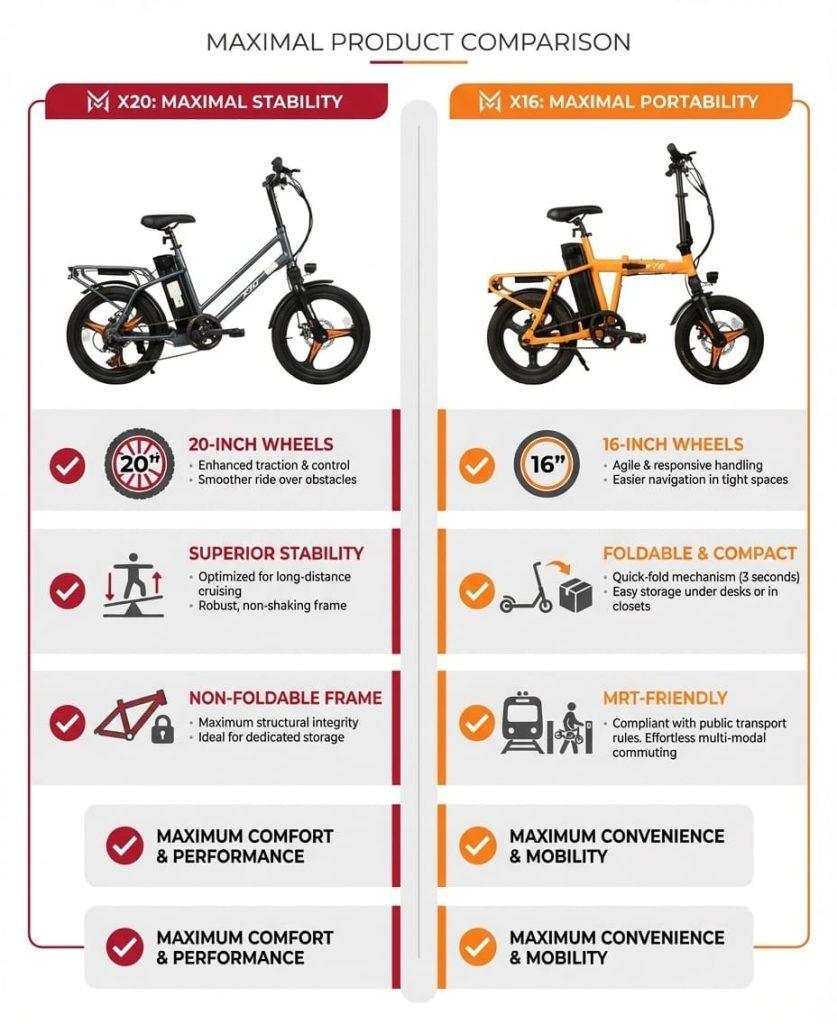 Pick Maximal X20 if you want the most stable daily work bike. Pick Maximal X16 if you must fold and bring it on MRT or store it tight at home. (maximal.sg)